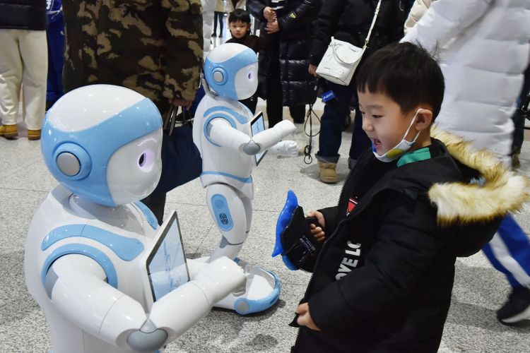 小朋友與“十四冬”機(jī)器人宣傳大使互動(dòng)。